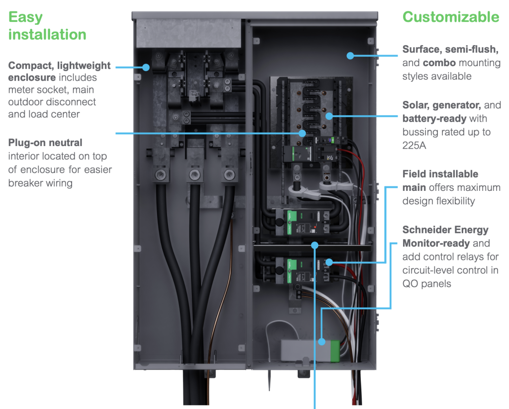 Square D QO and Homeline 300A/400A CSEDs combine the meter socket and outdoor disconnect into a single, compact, lightweight enclosure, designed for plug-on neutral circuit breakers. Each enclosure features an integrated load center, offering flexible options to stay compliant with evolving code requirements (AFCI, GFCI, and surge protection).
